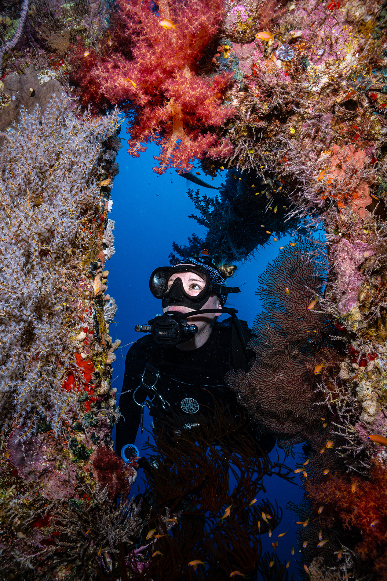 murciélago, coloridos peces payaso entre anémonas y bancos de pargos y jureles que llenan de movimiento los arrecifes. Incluso en los pecios como el SS Thistlegorm o el Giannis D, la vida marina se despliega en todo su esplendor, creando escenarios impresionantes bajo el agua.